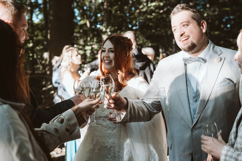 Die Verbindung zu Japan spielte auch in der Gestaltung der Hochzeit eine große Rolle. Die beiden haben das traditionelle japanische Hochzeitsritual „San San Kudo“ in ihre Zeremonie integriert – ein bewegender Moment. Bei diesem Ritual trinken Braut und Bräutigam jeweils drei Schlucke aus drei Sake-Schalen, was für Vergangenheit, Gegenwart und Zukunft steht. Besonders schön war, dass alle Gäste – Familie und Freunde – beim letzten Schluck einbezogen wurden, indem sie gemeinsam auf das Brautpaar angestoßen haben.